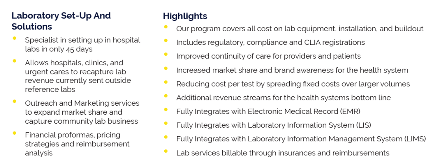 we assist in completion of CLIA, finding billing partners (if necessary) and direct laboratory layout